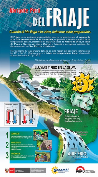 Así mismo, se prevé el descenso de las temperaturas del aire, principalmente en sectores de selva baja de la región sur y central. En Puerto Maldonado (Madre de Dios) se registrará una temperatura mínima de 17 °C, y una máxima de hasta 24 °C.