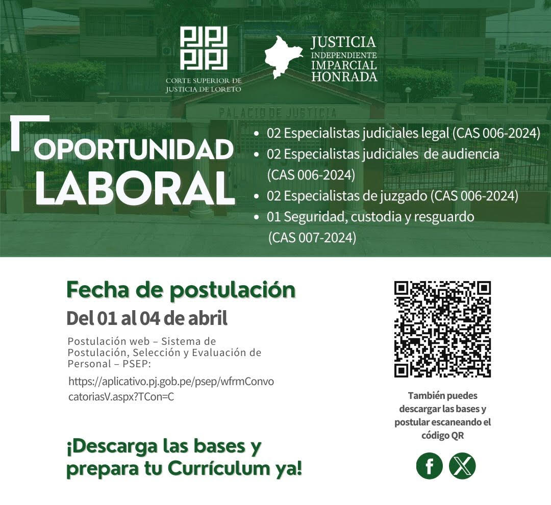 La Corte Superior de Justicia de Loreto invita al público a postular a las nuevas plazas de trabajo, lanzadas mediante concurso CAS N° 06-2024 y 07-2024.