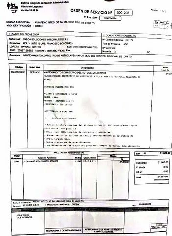 Mantenimiento correctivo de autoclave a vapor, con orden 0001208, pagaron 31 mil soles. Orden 0001205 para mantenimiento correctivo de la planta de oxígeno medicinal a 19,900 soles.