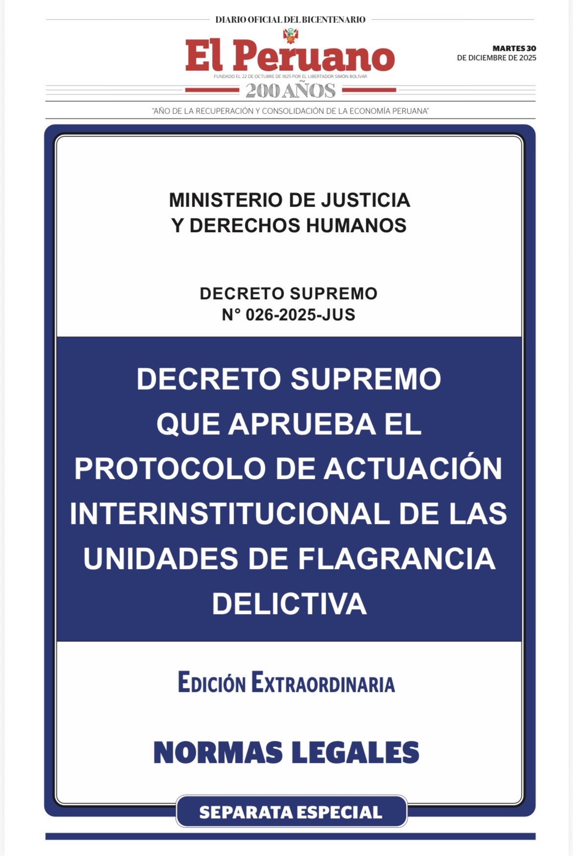 La reciente aprobación del Protocolo de Actuación Interinstitucional de las Unidades de Flagrancia Delictiva, mediante el Decreto Supremo N.° 026-2025-JUS, de fecha 30 de diciembre de 2025, constituye un hito fundamental para el fortalecimiento del Sistema Nacional de Justicia Especializado en Flagrancia Delictiva, al establecer reglas claras, uniformes y obligatorias que optimizan la intervención articulada de las instituciones que integran el sistema de justicia penal en el país.