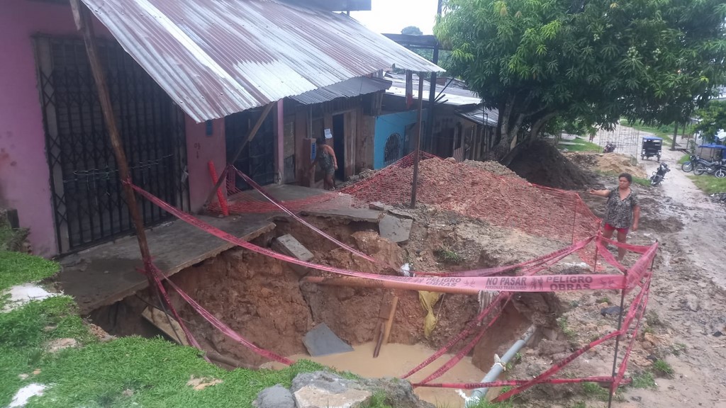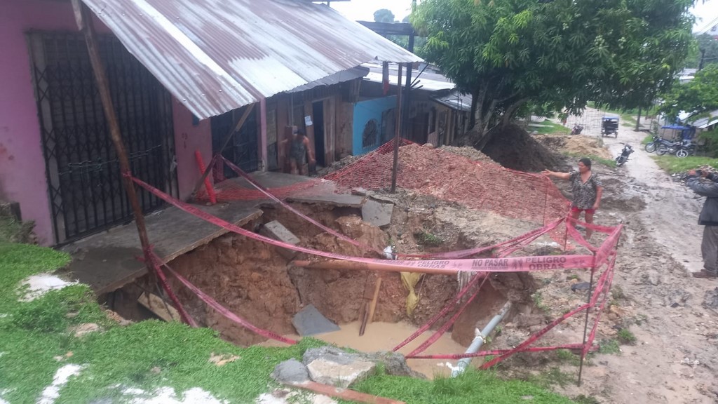 “Pueden observar y las veredas ya comenzaron a caer en el forado. Hay palos alrededor de soportan la carga, pero la lluvia está debilitando todo, en cualquier momento podría haber un colapso si no aceleran los trabajos que están realizando”, refirió una de las vecinas.