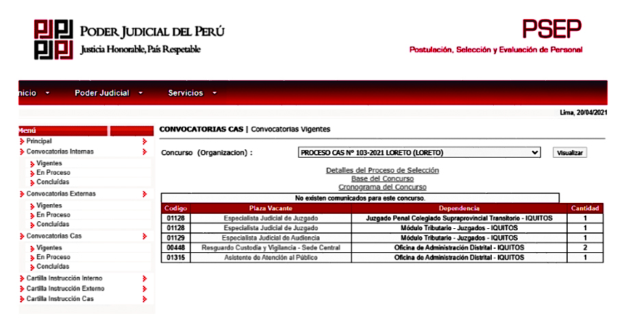 La Corte Superior de Justicia de Loreto lanzó hoy la convocatoria laboral para cubrir seis plazas en los puestos de especialista judicial de audiencias (01), especialista judicial de juzgado (02), asistente de atención al público (01); y resguardo, custodia y vigilancia (02).