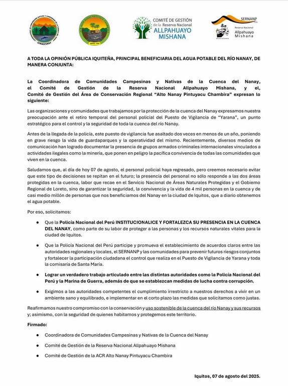 La Coordinadora de Comunidades Campesinas y Nativas de la Cuenca del Nanay, el Comité de Gestión de la Reserva Nacional Allpahuayo Mishana y el Comité de Gestión del Área de Conservación Regional (ACR) Alto Nanay Pintuyacu Chambira emitieron un pronunciamiento conjunto dirigido a toda la opinión pública iquiteña, recordando que del río Nanay depende directamente el abastecimiento de agua potable para casi medio millón de personas en la ciudad de Iquitos.
