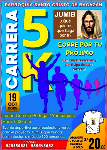 La Parroquia Santo Cristo de Bagazán anunció la realización de la carrera solidaria 5K “Corre por tu Prójimo”, programada para el próximo 19 de octubre. La actividad forma parte de las celebraciones por el 85° aniversario de la parroquia y los nueve años del proyecto social JUMIB, que brinda alimentación gratuita a 330 personas en situación vulnerable.