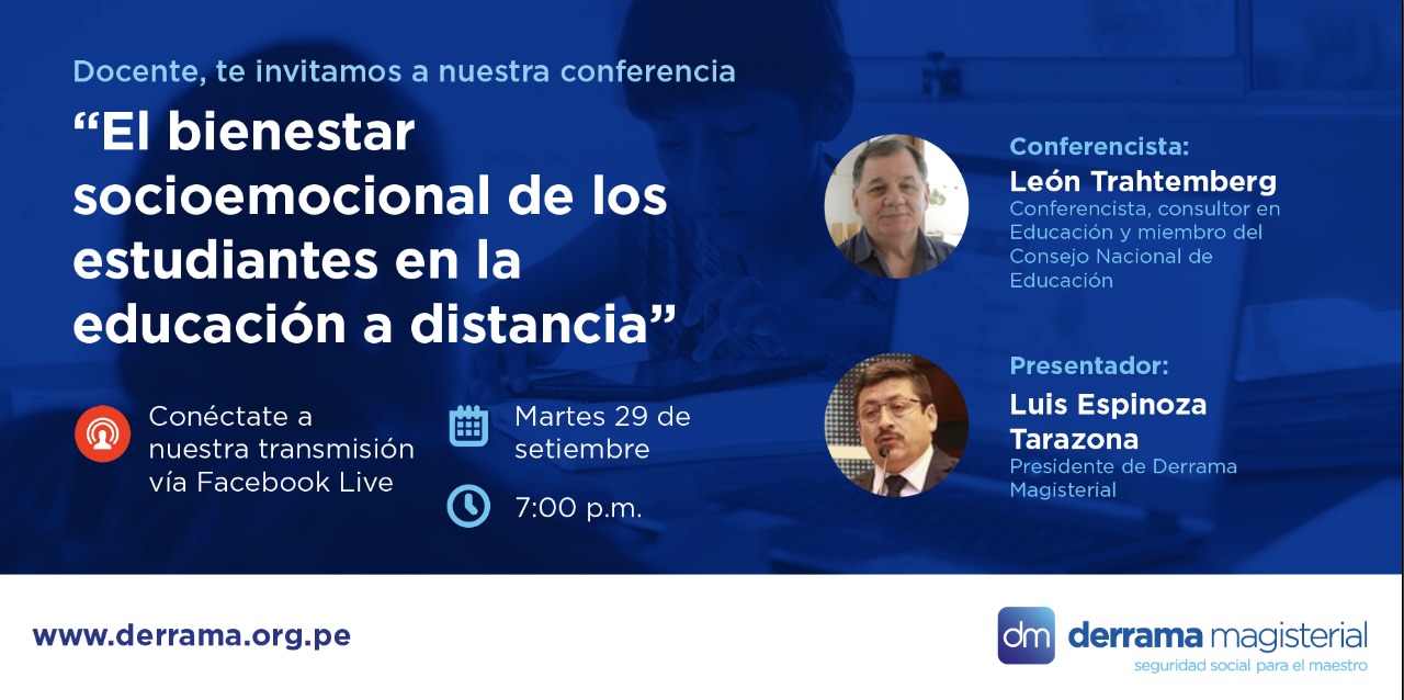Este martes 29 de septiembre a las 7:00 p.m. se desarrollará un tercer conversatorio, que tendrá como tema principal “El bienestar socioemocional de los estudiantes en la educación a distancia”. El mismo contará con la participación del presidente de Derrama Magisterial, Prof. Luis Espinoza Tarazona, y del reconocido educador León Trahtemberg.