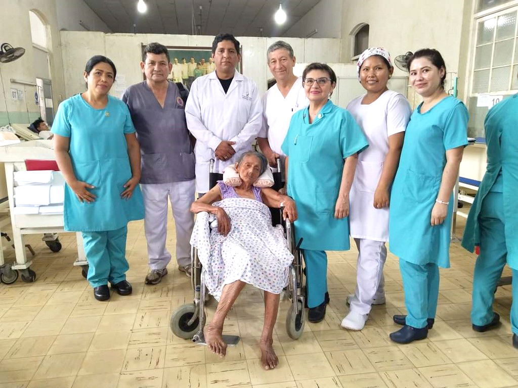 El médico neurocirujano Rony Gómez Rodríguez, fue el encargado de brindarle el alta médica, con participación del director del hospital Carlos Coral Gonzales, el médico interno Edgar Torres Tello y el equipo del departamento de cirugía del Hospital Apoyo Iquitos.