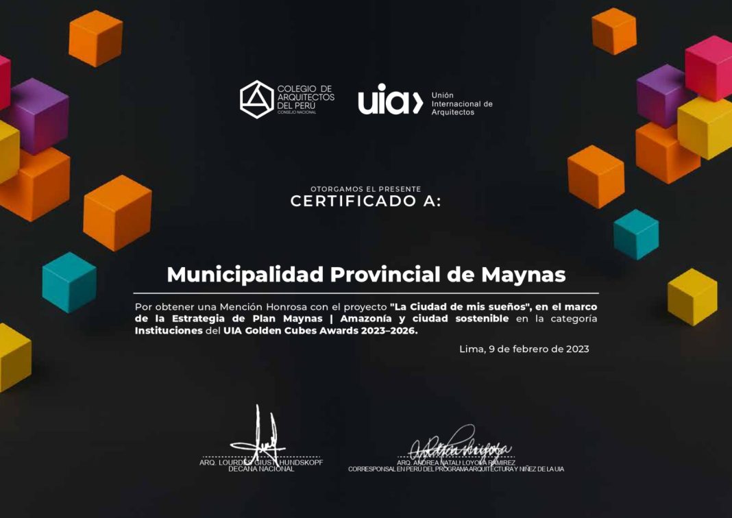 La Estrategia Plan Maynas | Amazonía y Ciudad Sostenible, impulsada por la Municipalidad Provincial de Maynas, recibió un reconocimiento internacional en los Golden Cube Awards 2026, uno de los premios más importantes a nivel mundial en educación sobre arquitectura, urbanismo y entorno construido para la infancia y juventud. El reconocimiento fue otorgado en la categoría Premio Institucional, destacando la experiencia desarrollada en la ciudad de Iquitos como un referente de planificación participativa con enfoque amazónico.