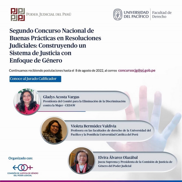 El Poder Judicial, a través de la Comisión de Justicia de Género, y la Facultad de Derecho de la Universidad del Pacífico oficializaron el lanzamiento del ‘Segundo Concurso Nacional de Buenas Prácticas en Resoluciones Judiciales: Construyendo un Sistema de Justicia con Enfoque de Género’, el cual tiene por finalidad incentivar y distinguir las buenas prácticas judiciales en temas de igualdad y violencia de género, así como reconocer la labor y el compromiso de juezas y jueces contra todo tipo de discriminación en nuestro país.