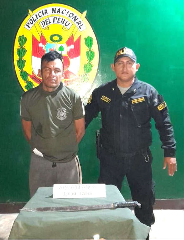 El accionar policial se produjo en circunstancias que una persona de sexo masculino ingresó raudamente a las instalaciones de la citada comisaría, en aparente estado de ebriedad, portando en la mano izquierda un arma blanca (machete) mango negro de plástico y jebe, marca “Bellota”, de 60 centímetros de largo aproximadamente, en regular estado de conservación, y de tras de él le seguía una turba de unas 10 personas adultas, con el propósito de atraparlo, indicando una de las personas que minutos antes el citado sujeto, valiéndose de dicho machete y sin motivo alguno había intentado cegar la vida a la persona de Emerson Ayambo Pinedo (29), a quien le provocó un corte en la sien izquierda, de donde le emanó abundante sangre, hecho ocurrido cuando bebían licor (Cerveza) a inmediaciones (Vía pública) del Asentamiento Humano “José Olaya Balandra” con San Martín – Caballo Cocha, siendo auxiliado por unos vecinos del lugar y trasladado al centro de salud, acompañado de su progenitor, señor, Elmer Ayambo Cumari (57), donde le brindaron las atenciones médicas del caso.