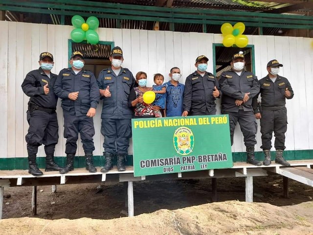 Personal policial de la comisaria rural de Bretaña – IV Macro Región Policial Loreto, con participación de las autoridades públicas, religiosas y población en general, procedieron a la entrega en calidad de donación de una vivienda construida de material semi-rustico a los esposos: Wilfredo Linares Espinoza (60) y Julia Torres Pacaya (50) ambos con habilidades diferentes (sordo mudos) y en situación de extrema pobreza, quienes tienen al cuidado a sus cinco hijos menores de edad.