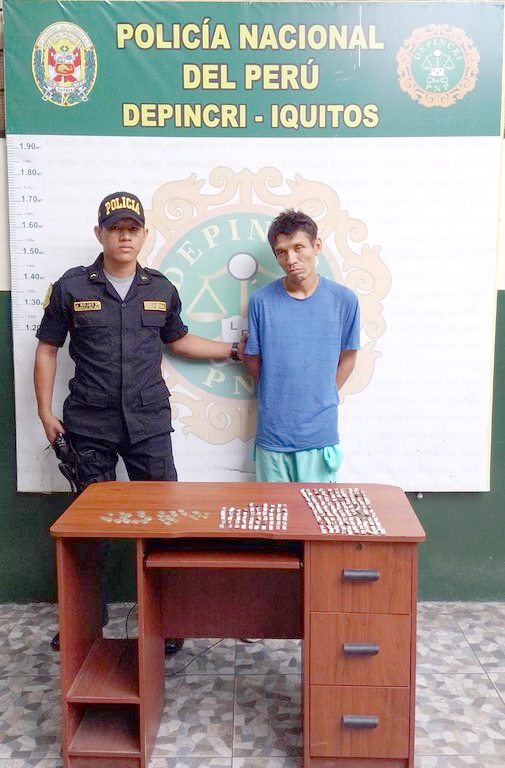 Agentes PNP del Depincri – Iquitos, en circunstancias que realizaban labores de patrullaje preventivo por los diferentes puntos críticos de la ciudad, con la finalidad de intervenir y contrarrestar el accionar delictivo de personas suelen estar al margen de ley, inmersos en acciones ilícitas, en sus diversas modalidades, como robo, hurto, tráfico ilícito de drogas, requisitoriados y otros, estando a inmediaciones de las calles Pevas con Raymondi, lograron intervenir y detener a la persona que refirió llamarse Francisco Aching Gárate (34), alias “Yuca”, cuando se desplazaba a inmediaciones de la discoteca “La casa de las Enchiladas”, distribuyendo estupefacientes y/o sustancias tóxicas.