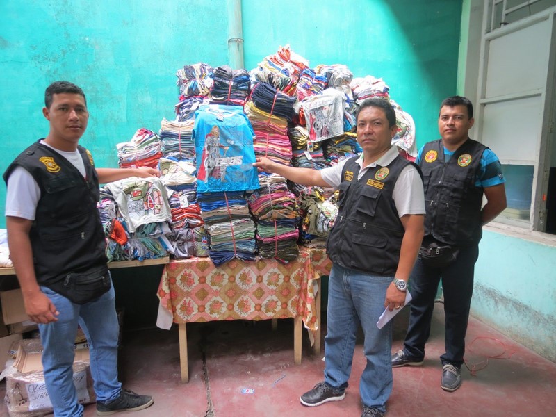 Fuentes policiales informaron que lograron incautar 4 mil 552 polos de algodón para niños que presentaban impresiones con signos distintivos y personajes de marcas registradas por terceros como: “Marvel Avengers”, “Spiderman”, “Ben 10”, “Cars”, “Minions”, entre otros, la cual tenía como destino el local comercial “O. LANIA” E.I.R.L ubicado en el Jr. Próspero Nº 1177-dsitrito de Belén.