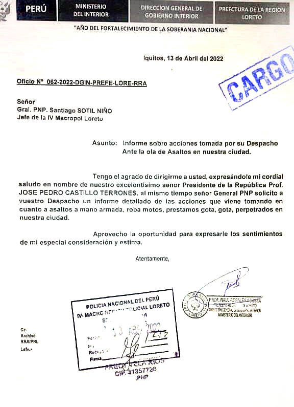 A través del oficio 062-2022, el Prefecto de Loreto Prof. Raúl Rosales Acosta, le pide de manera urgente al general PNP Santiago Sotil Niño, Jefe de la IV Macropol Loreto; que le informe sobre las acciones tomadas por su despacho ante la ola de asaltos en Iquitos.