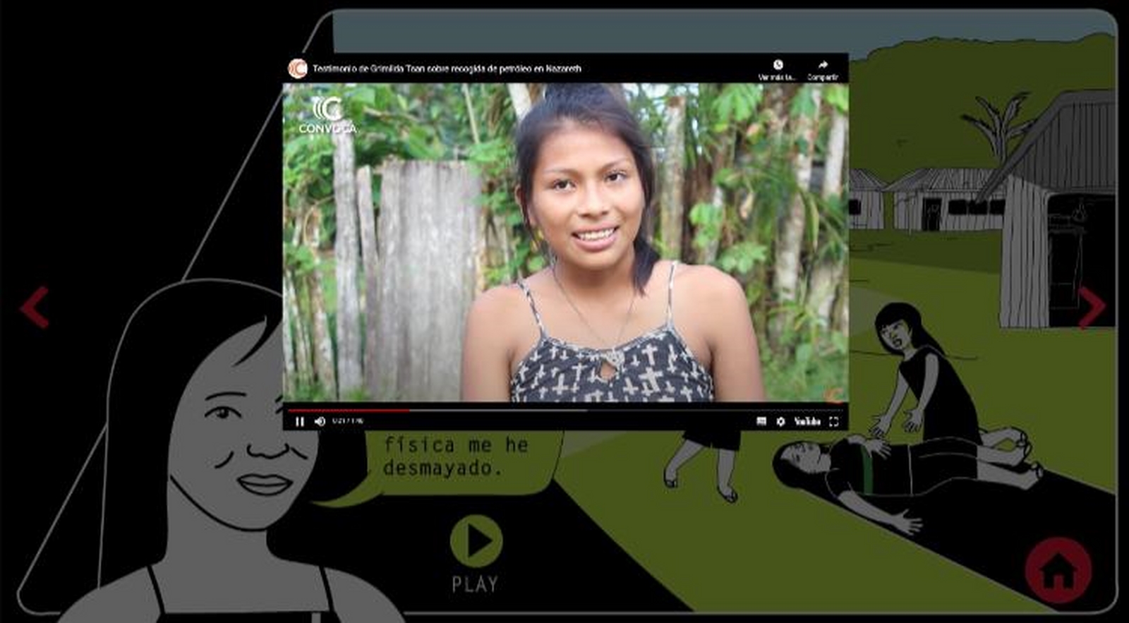 Se puede acceder al cómic interactivo copiando en un buscador el enlace: https://convoca.pe/expediente-toxico-el-comic/nazareth. Recordemos que en el caso de la región Loreto, el caso más conocido de contaminación por derrame de petróleo en los últimos años se dio en 2014 en la quebrada de Cuninico, cuando 2358 galones de petróleo cayeron cerca de la quebrada de la cual se abastecen comunidades kukamas, las cuales hasta la fecha no reciben la atención integral debida. (A. Padilla)