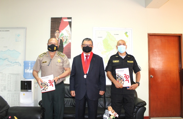 De otro lado, el doctor Carlos Del Piélago también hizo propicia la ocasión para saludar y felicitar al General PNP Santiago Sotil, con motivo de su reciente designación en el cargo, expresándole los deseos de éxito al frente de la IV Macro Región Policial de Loreto, a la vez de ratificar su compromiso de seguir trabajando coordinadamente para el beneficio de ambas instituciones y de toda la comunidad en general.