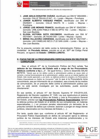 -Clara Bustamante Pezo, presuntos cómplices, Francisco Sanjurjo Dávila, Jane Donayre Chávez, Joiner Alberto Vásquez Pinedo, Jorge Luis Monasí Franco. Eloísa Soto Escobedo, Mirna Villacorta Cárdenas y los que resulten responsables. Por el presunto delito en la modalidad de peculado doloso”.