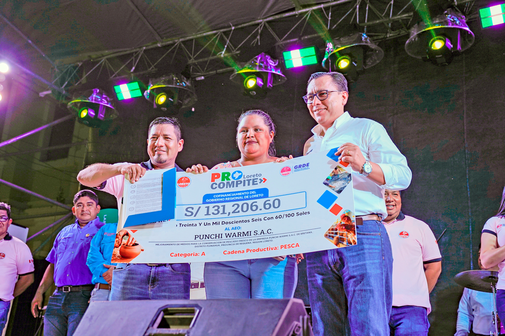 El ministro de la Producción, Sergio González, y el gobernador regional de Loreto, René Chávez, entregaron un cheque simbólico que oficializa el cofinanciamiento del fondo Procompite al proyecto de la empresa Punchi Warmi –integrada por mujeres de Puinahua– que forma parte del Proyecto de Innovación Pesquera apoyado por PetroTal.