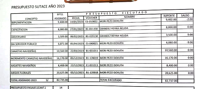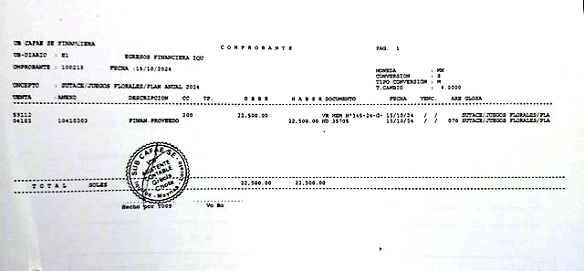 Entre las evidencias se observa que por el concepto de Juegos Florales el 15 de octubre del 2024, Doylith Mori Pezo (Sutace), habría recibido 22,500 soles conforme al Voucher E1-100215. También se evidencia que la misma fecha y con Voucher E1-100216, Aracely López (Sitase) recibió el importe de 22,500 soles. Similar habría ocurrido el año 2023 con Voucher B1-120022, con el monto de 20,625 soles, para juegos florales que tampoco se realizó ese año.