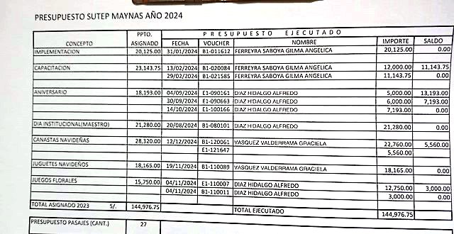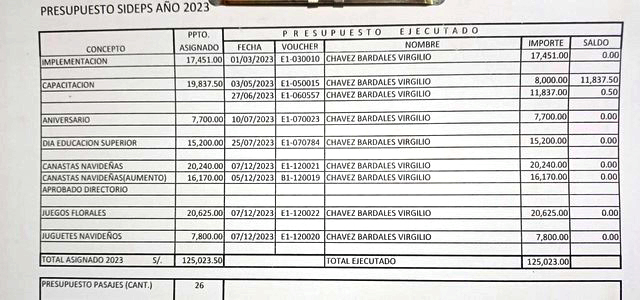Otra documentación precisa que el gremio Sutep Maynas como parte del directorio del Sub Cafae Iquitos SE, se le asignó por juegos florales el 4 de noviembre de 2024, con voucher E1-110007, a nombre de Alfredo Díaz, 15,750 soles. En tanto que aparece en el presupuesto del año 2023, la asignación al Sideps por concepto de juegos florales, con voucher E1-120022, de fecha 7 de diciembre de 2023, la suma de 20,625 soles; y por el mismo concepto el Sideps fue asignado el 2024 con 22,500 soles el 05 de noviembre de 2024, a nombre de Bruno Pérez, con voucher E1-110006.