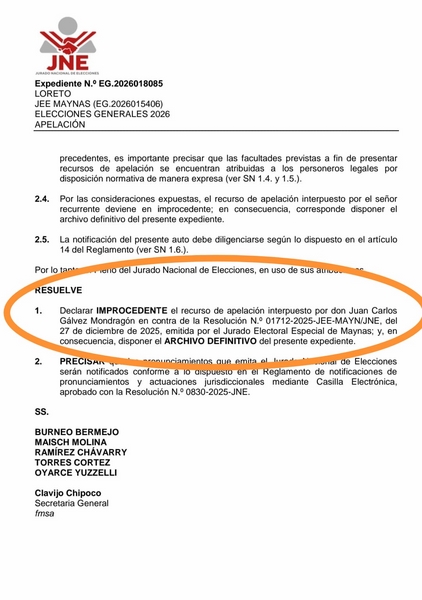 Así se desprende del Auto Nº 1, emitido el 9 de enero de 2026 por el Pleno del JNE, mediante el cual se declaró improcedente el recurso de apelación interpuesto contra una resolución del Jurado Electoral Especial (JEE) de Maynas, relacionada con la admisión e inscripción de la lista de candidatos al Senado por el distrito electoral de Loreto presentada por Fuerza Popular.