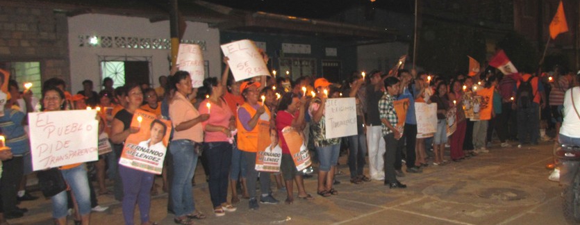 Cerca de 50 personas que portaban pancartas y unas velas en sus manos, realizaron una vigilia el día de ayer en el frontis del Jurado Nacional de Elecciones (JNE) ubicado en la calle Alzamora en apoyo a su líder Fernando Meléndez Celis, quien resultara tachado. A decir del secretario de organización del MIL, el que estaría detrás de todo esto sería gente ligada al movimiento «verde oscuro» que quieren a toda costa que Meléndez Celis no participe de esta justa electoral, «no tenemos ningún pronunciamiento hasta el momento del Jurado, será hace unas dos horas atrás que se han presentado las observaciones de la tacha de nuestro candidato y esperamos que el Jurado se pronuncie de manera positiva, porque realmente no existe ninguna jurisprudencia para ser tachado por un plan de gobierno, cosa pues que está preocupando a la militancia y población en general. No hay ningún asidero para que nos tachen por un plan de gobierno, si fuera así casi todos los movimientos correrían la misma suerte. Por eso la militancia del Movimiento de Integración Loretana/MIL y el pueblo en general, tenemos este gran respaldo en esta oportunidad, por eso estamos disciplinadamente en esta vigilia, acto que estamos demostrando nuestro descontento por esa situación anómala. Detrás de esto está la oposición del partido verde, vamos a calificarlo de esta manera, del verde oscuro, eso es lo que justamente están demostrando ellos al querer sacar de carrera al próximo presidente regional», sostuvo el dirigente.