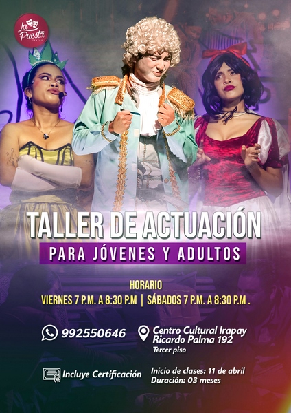 Las inscripciones ya se encuentran abiertas y pueden realizarse a través del número telefónico 992550646, así como mediante las redes sociales de la compañía en TikTok, Facebook e Instagram, donde figuran como La Puesta Teatro. (K. Rodriguez)