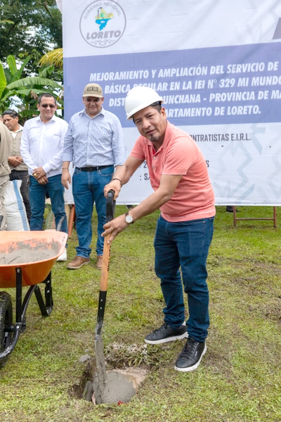 El gobernador regional de Loreto, René Chávez Silvano, encabezó la colocación de la primera piedra del proyecto de mejoramiento y ampliación del servicio de educación básica regular en la Institución Educativa Inicial N.° 329 “Mundo Feliz”, ubicada en el distrito de Punchana, provincia de Maynas, dando inicio a una obra largamente esperada por la población educativa del sector.