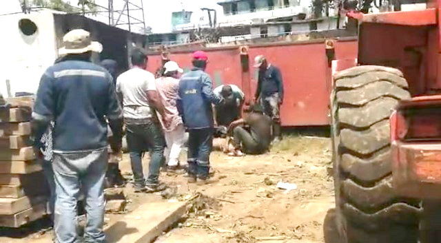 Personal policial del puesto de intervención rápida Masusa – Comisaria Punchana, brindaron auxilio a la persona de Jesús Mozombite Ramos (42), trabajador independiente, quien horas antes había quedado atrapado bajo un container de metal, al tratar de transportar, junto a un grupo de personas, la estructura metalica de acero a otro lugar, utilizando polines de madera redonda con gata hidráulica.