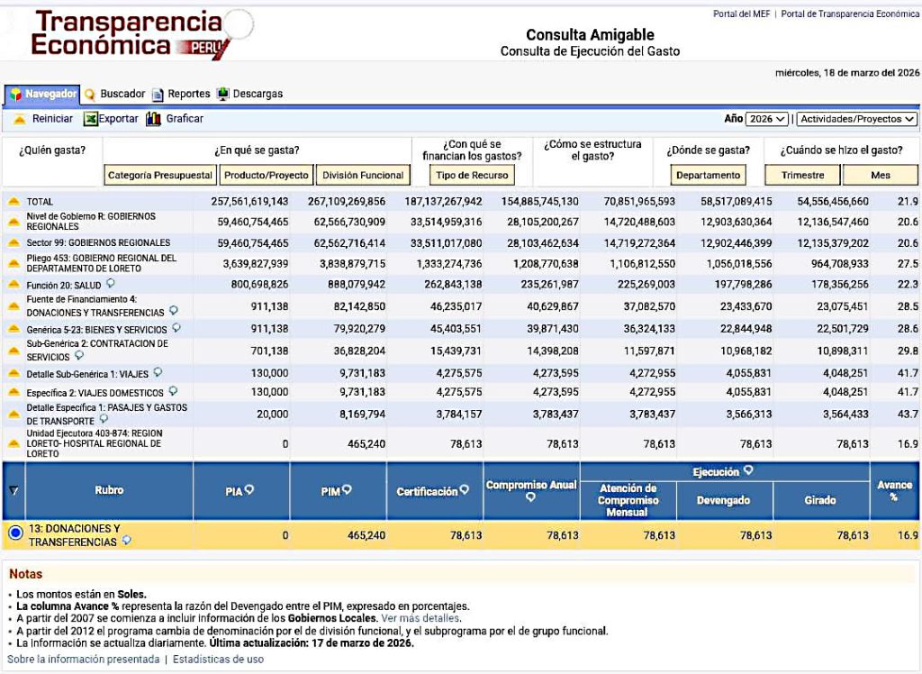 “En el hospital no ha sucedido eso, está garantizado el presupuesto por el SIS. En la revisión de la consulta amigable del portal de transparencia económica del ministerio de economía y finanzas, claramente está acreditada la disponibilidad de presupuesto para las referencias de los pacientes del seguro integral de salud del hospital regional de Loreto.