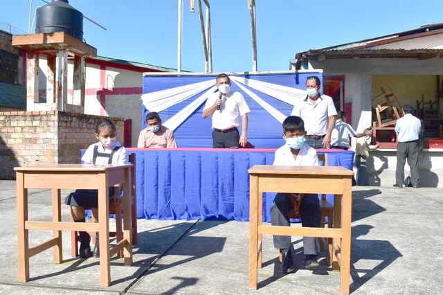 Con la presencia en el lugar de los hechos, del señor alcalde Martín Arévalo Pinedo, la municipalidad de San Juan Bautista, hizo entrega de 5 módulos escolares en un total de 145 sillas y 145 mesas, al Centro Educativo Primario de Menores 601581 Corazón de Jesús, de la zona del Terminal Terrestre, carretera Iquitos Nauta.