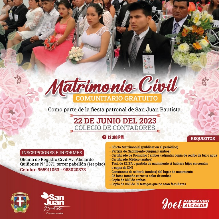 Con la finalidad de formalizar las uniones conyugales y hacer una vida en común, el próximo 22 de junio, la División de Registro Civil de la Municipalidad Distrital de San Juan Bautista realizará el Primer Matrimonio Civil Comunitario Gratuito en las instalaciones del Colegio de Contadores a horas 12:00 p.m.