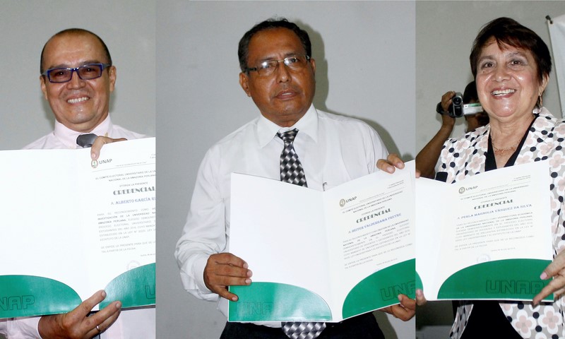 Las autoridades electas de la UNAP, y quienes recibieron sus credenciales, son: Heiter Valderrama Freyre (rector), Perla Magnolia Vásquez Da Silva (vicerrectora Académica), Alberto García Ruíz (vicerrector de Investigación). Nuevos decanos: Carmen Díaz de Córdova (Enfermería), Róger Ángel Ruíz Frías (Ciencias Biológicas), Carlos Alberto García Cortegano (FISI), Hugo Emerson Flores Bernuy (Ingeniería Química), Tedi Pacheco Gómez (Ciencias Forestales), Julia Victoria Vásquez Villalobos (FCEH).