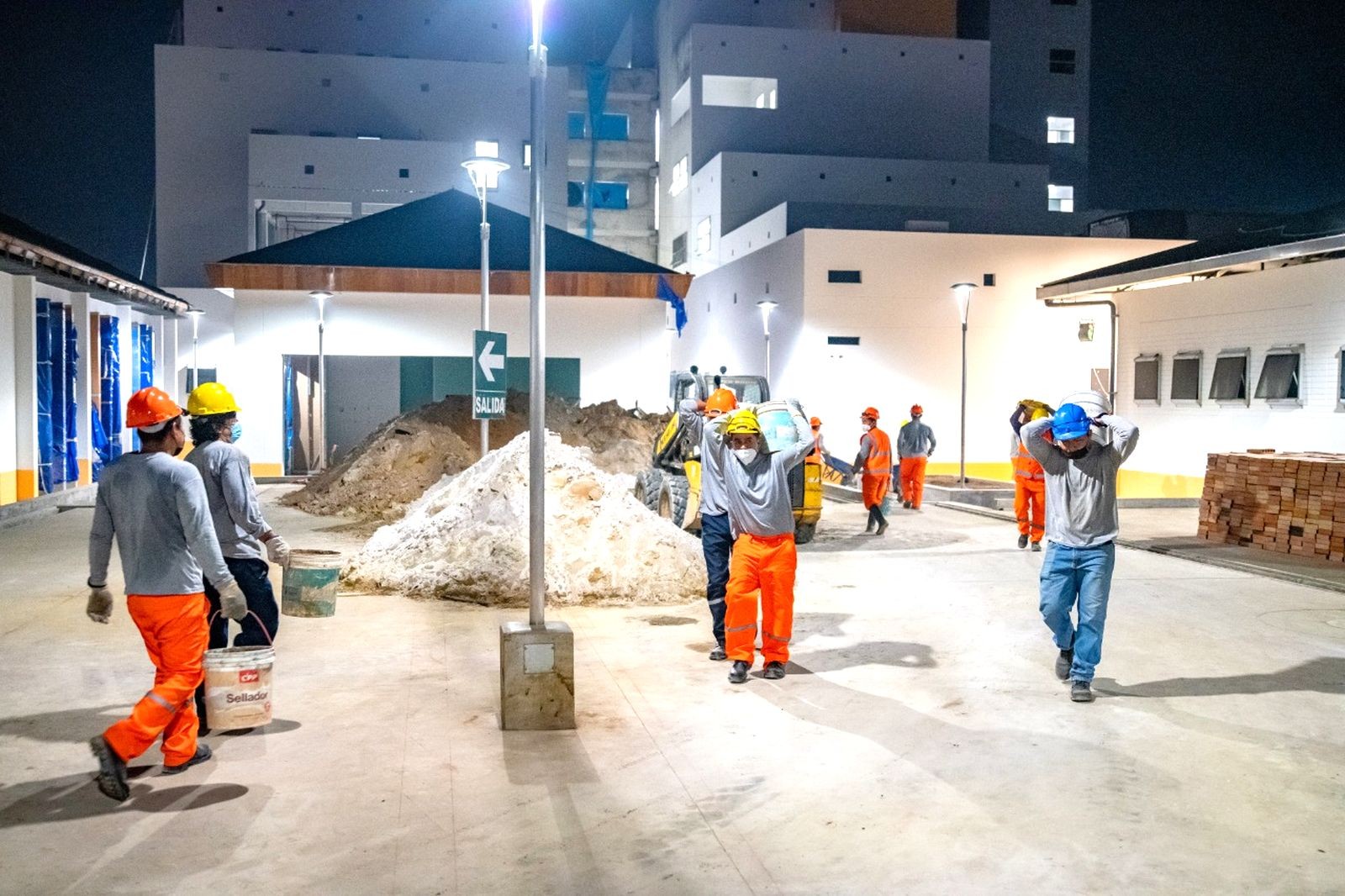 Más de un centenar de obreros trabajan en el turno nocturno para culminar la ejecución del hospital. A la fecha se viene ejecutando los trabajos en la demolición para la creación de una jardinería. También se lija, imprime y pintan los diferentes ambientes. Además, se instala la sub estación que permitirá la conexión eléctrica en todo el hospital.