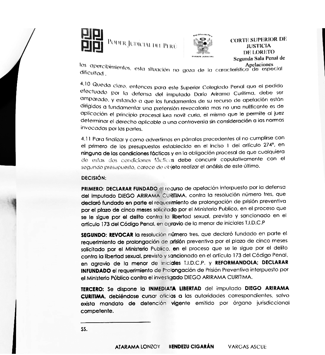 Con fecha 28 de enero 2025, la Segunda Sala Penal de Apelaciones de la Corte Superior de Justicia de Loreto, emitió la Resolución N° 6, mediante la cual dispone la inmediata libertad de Diego Arirama Curitima, imputado por el delito contra la libertad sexual.