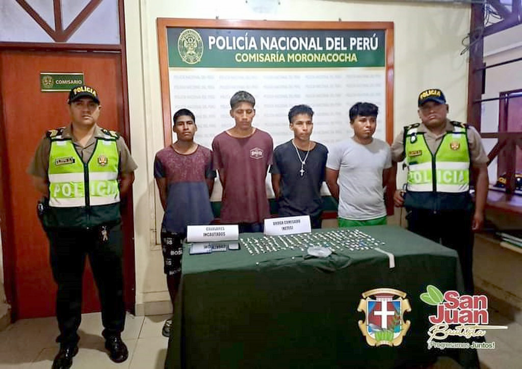 En un trabajo articulado y conjunto, el personal del serenazgo de la Municipalidad Distrital de San Juan Bautista con la comisaría Moronacocha de la Policía Nacional del Perú, se constituyeron hasta la calle Ampliación “San Pedro y San Pablo”, en el sector de Pucayacu, donde intervinieron a Bryan Alarcón Noa, Alexander Germán Vílchez Celis, Alfredo Pipa Oliveira y Pedro Ramírez López, quienes se encontraban merodeando la zona en actitud sospechosa y habrían incurrido en el presunto Delito Contra la Salud Pública – Tráfico Ilícito de Drogas.