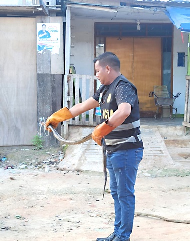Los vecinos de la calle Ampliación Esperanza, ubicado en el asentamiento humano Simón Bolivar, encontraron una serpiente en el interior de la vivienda de de un morador. De inmediato dieron aviso a la policía Ecólogica para que se hicieran cargo del animal.