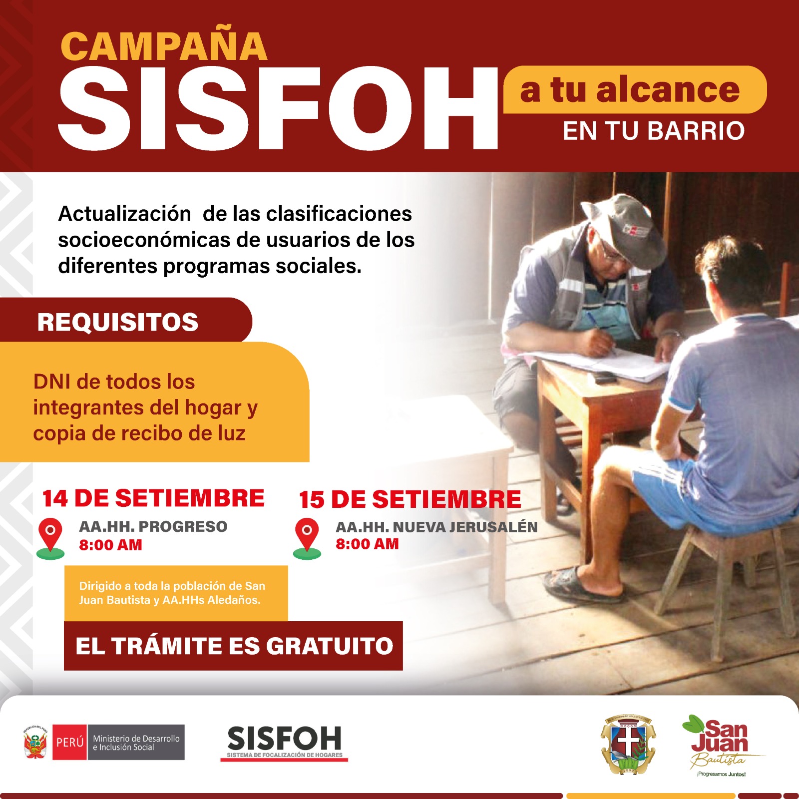 Con la finalidad de realizar la actualización de la Clasificación Socioeconómica de los usuarios de los programas sociales Pensión 65, Juntos, Contigo Beca 18, Orfandad y SIS, que están por vencer, la Unidad Local de Focalización de la Municipalidad Distrital de San Juan Bautista, ha iniciado la Campaña “SISFOH a tu Alcance en tu Barrio”, dirigido a toda la población del distrito sanjuanino y asentamientos humanos aledaños.