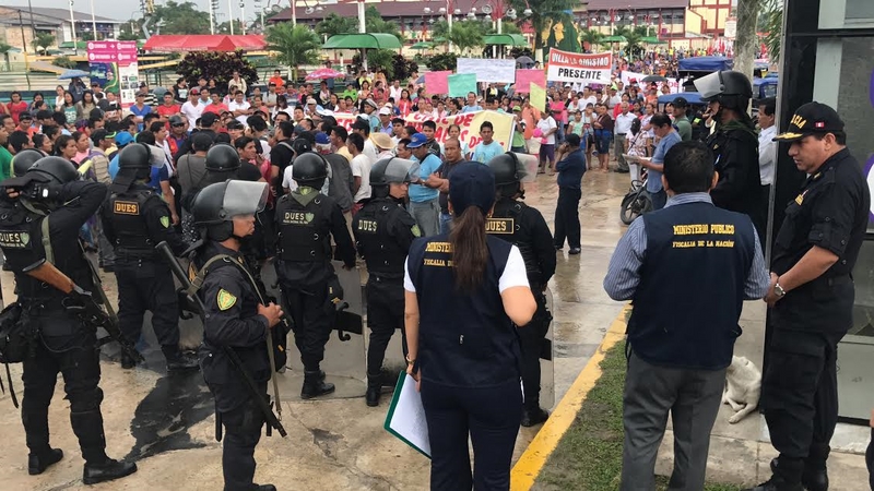 El fin de semana, el fiscal adjunto provincial de la Primera Fiscalía Provincial de Prevención del Delito, Isidro Hugo Baños Castro, en coordinación con el comandante PNP, jefe del Escuadrón de Emergencia, Walter Quispe Tipe, y personal de la DUES, se constituyó a las inmediaciones de la plaza Abelardo Quiñones del distrito de San Juan Bautista, donde se realizaba una protesta contra las autoridades regionales.