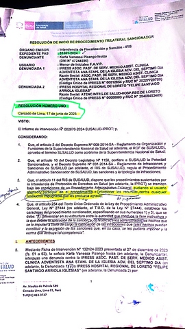 “La IFIS de la revisión de los actuados y teniendo a la vista el informe de intervención 002670-2024-SuSalud-IPROT-, considera que habría indicios que permiten considerar el inicio de un Procedimiento Trilateral Sancionador contra la IPRESS Asoc. Past. de Serv. Médico Asistencial- Clínica Adventista Ana Stahl de la Iglesia Adventista del Séptimo Día y la IPRESS Hospital Regional de Loreto “Felipe Santiago Arriola Iglesias”, por la presunta infracción administrativa”, puntualiza SuSalud.