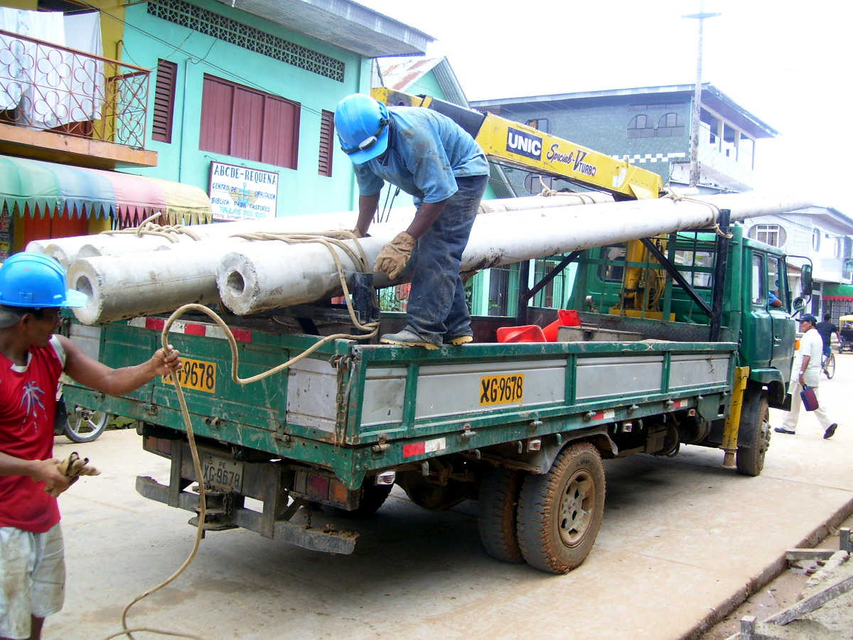 René Manuyama (Corresponsal en Requena).- Personal técnico de Electro Oriente viene realizando trabajos de reforzamiento y cambio de grandes postes de las redes eléctricas del servicio de alta tensión.