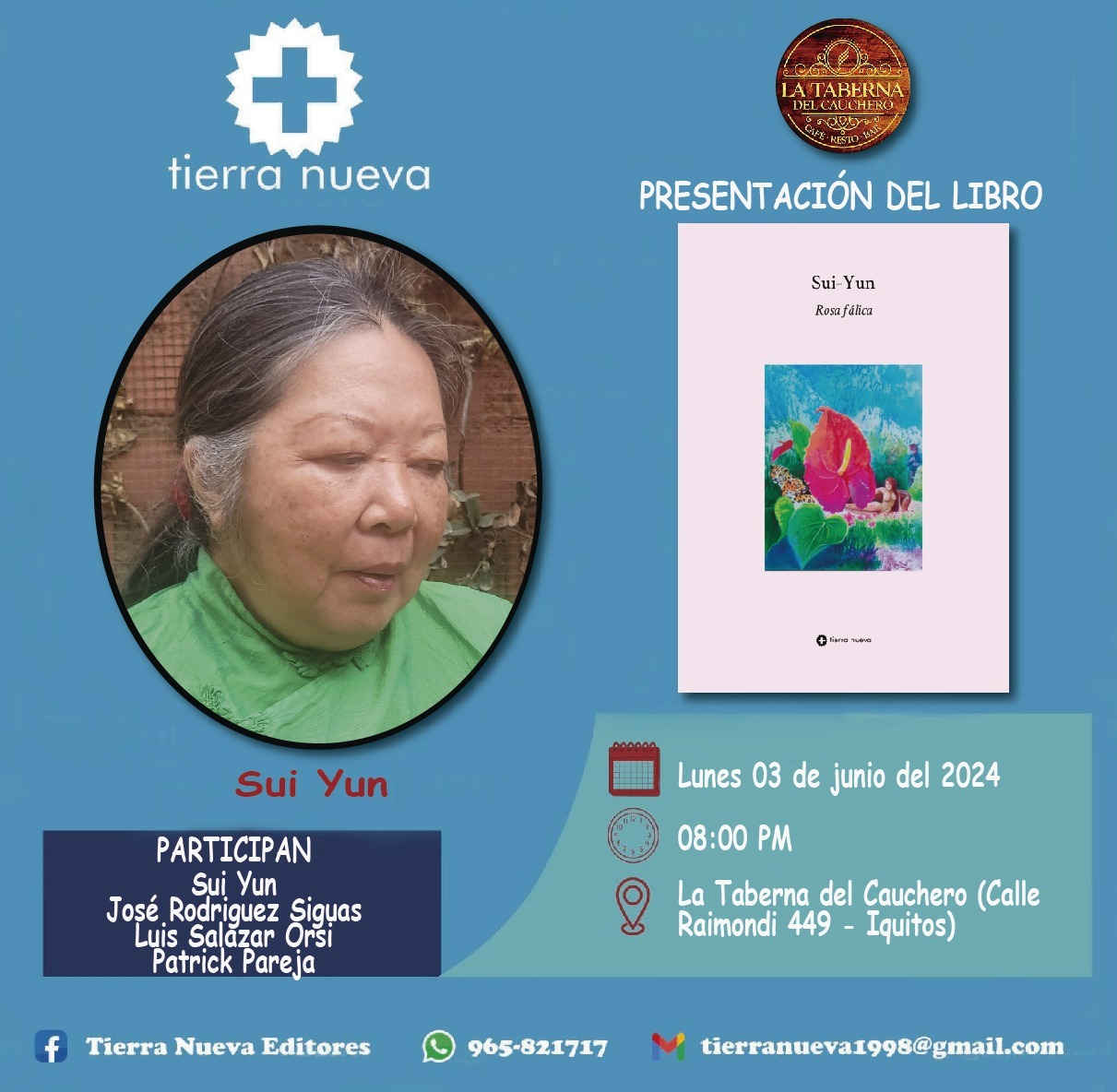 Entre el sábado 1 y martes 4 de junio la editorial amazónica Tierra Nueva ha programado la presentación de tres publicaciones para diverso público y lectores en Iquitos, capital de la región Loreto y en la que estarán presentes los autores Gino Ceccarelli, Sui Yung y Alejandro Vásquez tanto en el salón principal de “El Cauchero” como en el auditorio de la DDC Loreto, según informó el editor Jaime A. Vásquez Valcárcel.