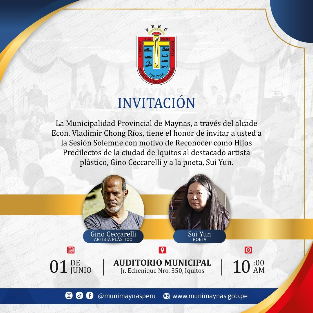 Además, Vásquez Valcárcel señaló que el alcalde de Maynas, Vladimir Chong Ríos, presidirá la mañana del sábado una sesión solemne en la que se declarará como “hijos predilectos” a la poeta Gino Ceccarelli y Sui Yun como un reconocimiento no sólo al trabajo artístico que desarrollan sino a la difusión de la pintura y las letras amazónicas en otras ciudades del país, de Estados Unidos y Europa.