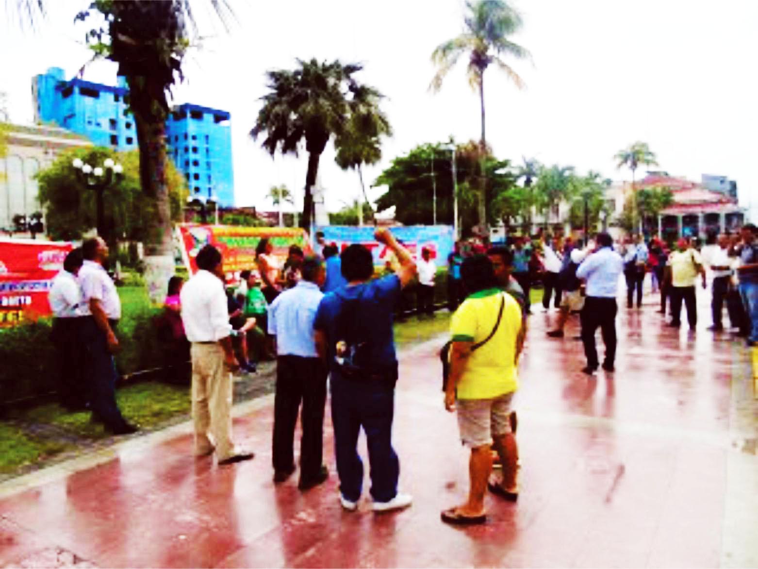 Ayer en la mañana los trabajadores se concentraron en la plaza de Armas, para desde ahí lanzar arengas contra el ministro de educación y su asesora legal, puesto que luego de los 12 días de huelga, pudieron conseguir algunos beneficios a su economía. También que no haya descuentos por la huelga asumida.