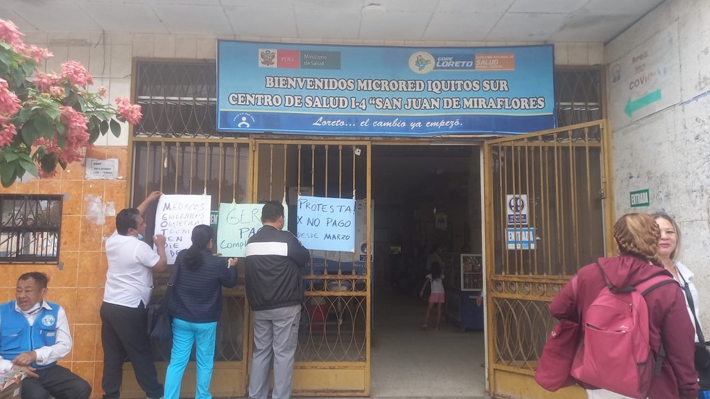 Los trabajadores asistenciales del centro de salud I-4 San Juan de Miraflores, ubicado en la calle Los Ángeles del distrito de San Juan Bautista realizaron una protesta en contra de la Gerencia Regional de Salud de Loreto para exigir el pago por sus jornadas de labores.