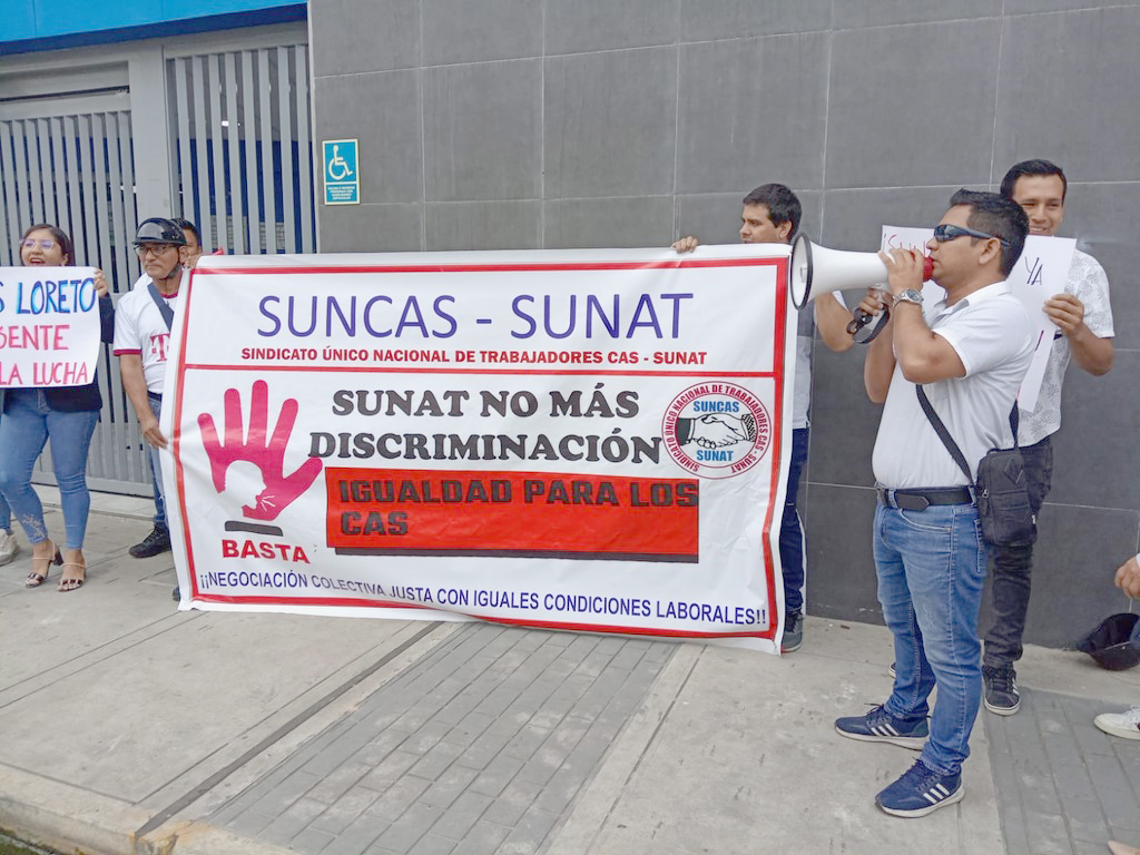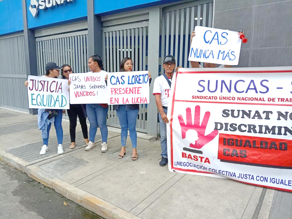 Un grupo de trabajadores de la Superintendencia Nacional de Aduanas y de Administración Tributaria (SUNAT) que labora en la ciudad de Iquitos y están agremiados al Sindicato Único Nacional de Trabajadores CAS SUNAT (SUNCAS SUNAT) acataron un paro de 24 horas convocado a nivel nacional.