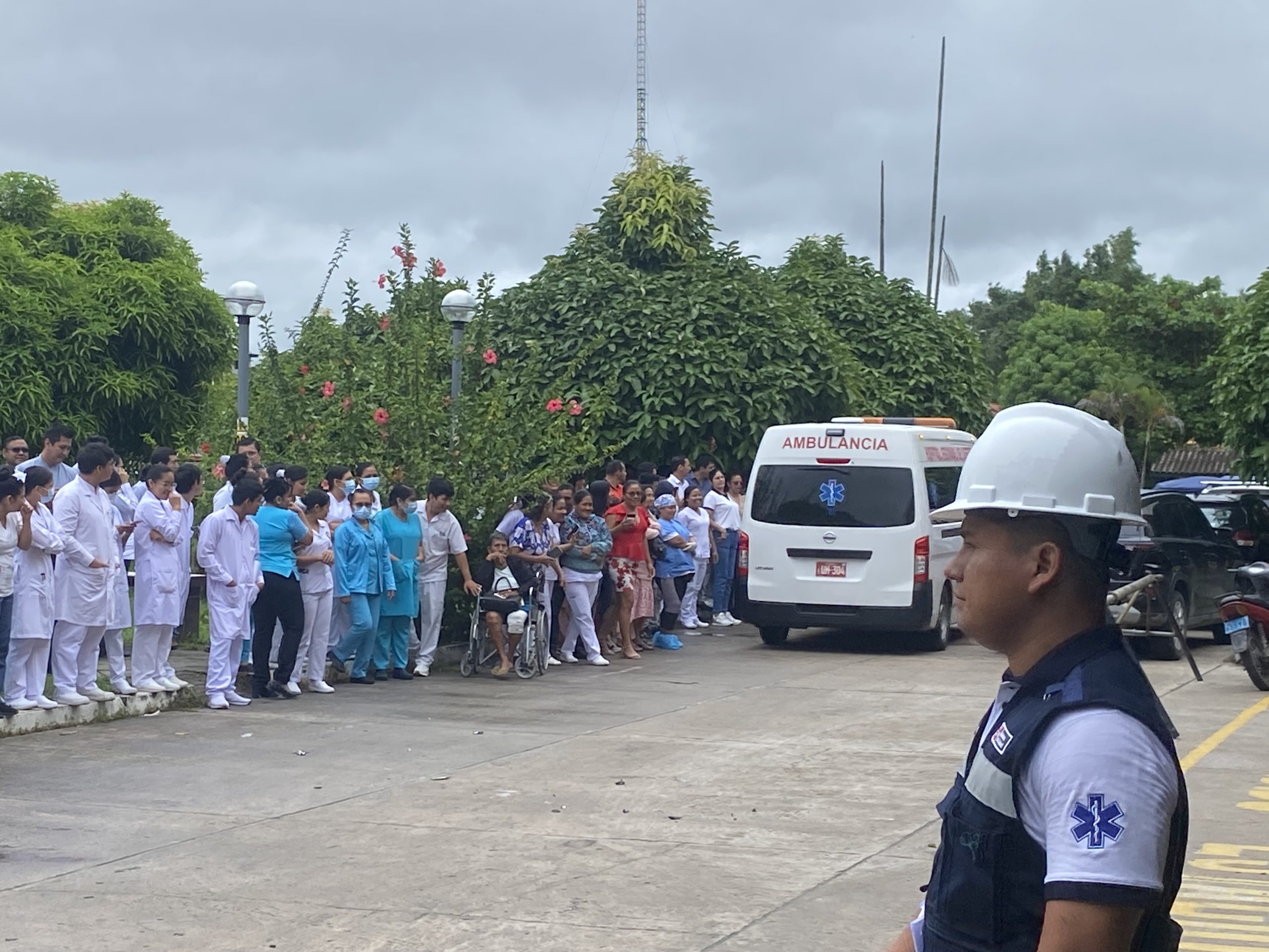 Las autoridades del hospital, entre ellos el director y jefes de algunos servicios, salieron y se pararon en el frontis del nosocomio. Posteriormente salieron los trabajadores de manera ordenada a ubicarse frente al establecimiento, en el jardín que lo rodea. No se utilizaron los ascensores, bueno los dos que están buenos porque hay uno que lleva semanas sin dar el servicio.