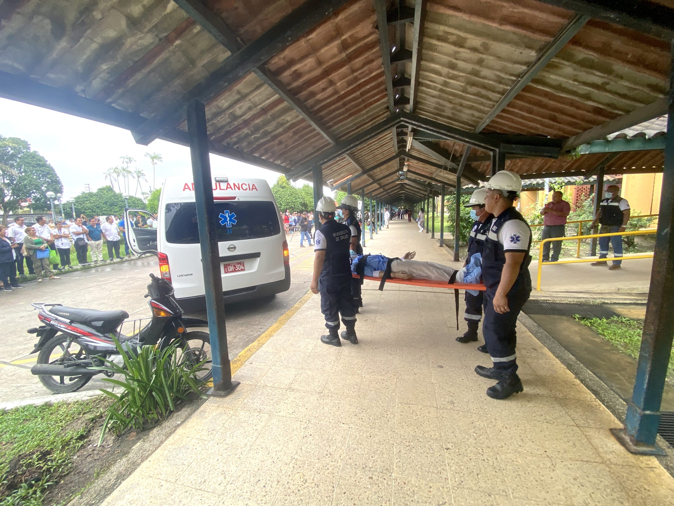 Hubo personal de defensa civil que simularon sacar enfermos y hasta un recién nacido. Lo que llamó la atención de todos los presentes, fue cuando ingresó la ambulancia. Mientras que personal de salud lo esperaba en la entrada con una camilla y supuestamente un paciente (un muñeco); la ambulancia moderna ingresó aceleradamente.