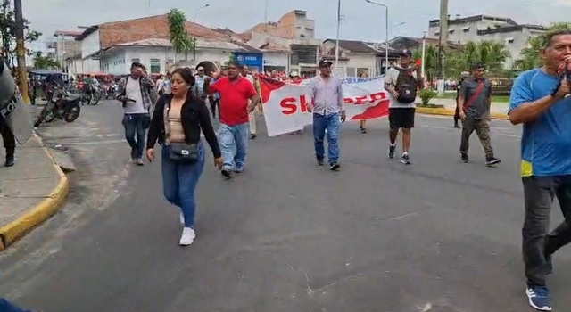 Tras la concentración en la plaza, los manifestantes marcharon por las principales calles del centro de Iquitos, expresando su rechazo a la iniciativa legislativa y exigiendo respeto a sus derechos laborales.