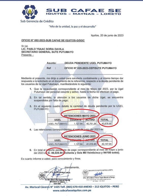 El 20 de junio 2023 la dirección del sub cafae Iquitos nos contesta con oficio 082-2023, indicando que hay una deuda pendiente de la Ugel Putumayo. Firman el informe los sub gerentes de crédito y administración. No pagaron pese a que nos descontaron, por eso pedimos a la gerencia regional que tome medidas correctivas ya que esta es una prueba fehaciente de la mala gestión que viene realizando la directora de la Ugel Putumayo”, remarca Soria.