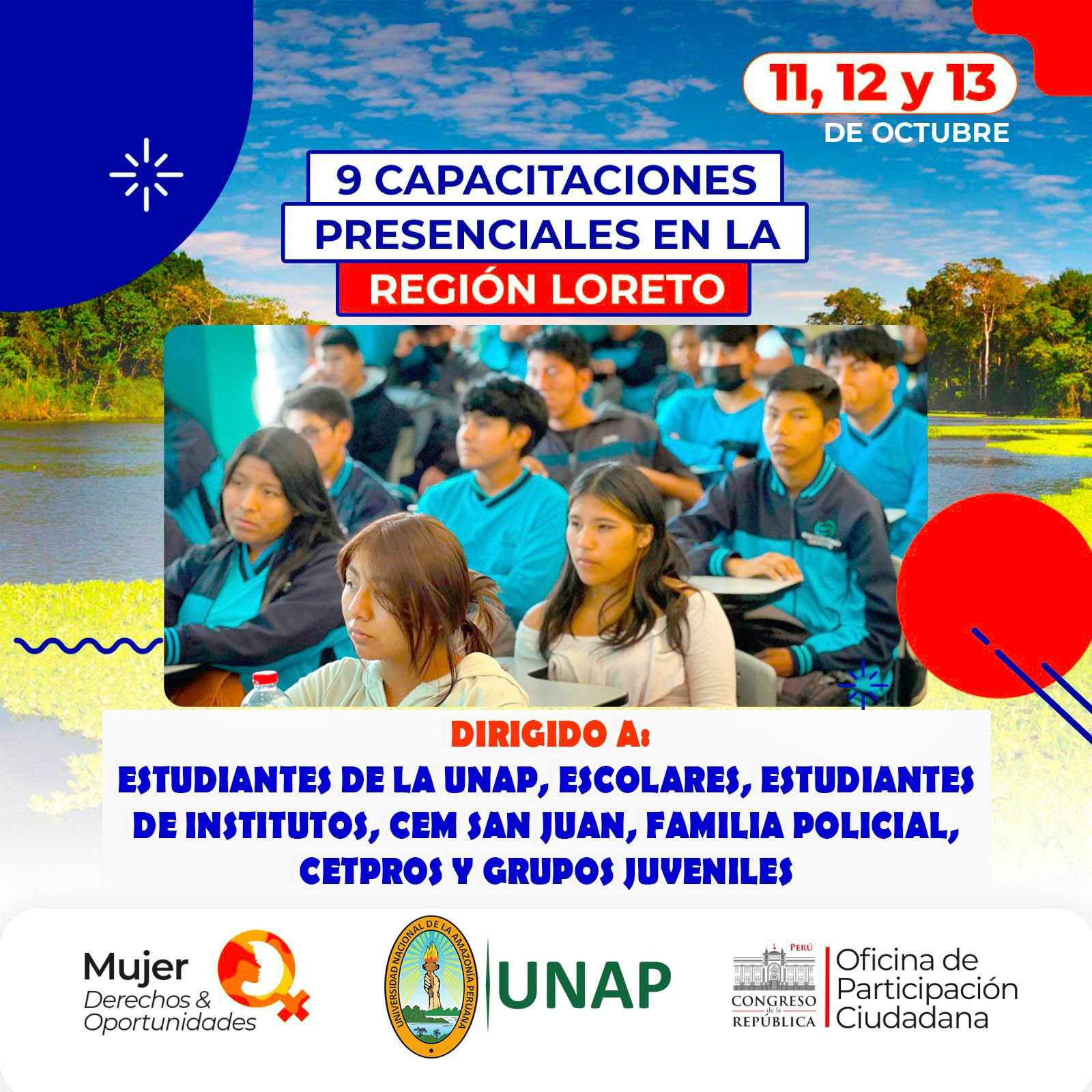 La Universidad Nacional de la Amazonía Peruana (UNAP), en coordinación con el Congreso de la República, a través de la Dirección de Responsabilidad Social, tiene programo el desarrollo del Taller: “Mujer, derechos y oportunidades; módulo: prevención, empoderamiento y emprendimiento”, evento que se llevará a cabo los días 11, 12 y 13 de octubre de 2023 en el aula magna y el CRISAP.